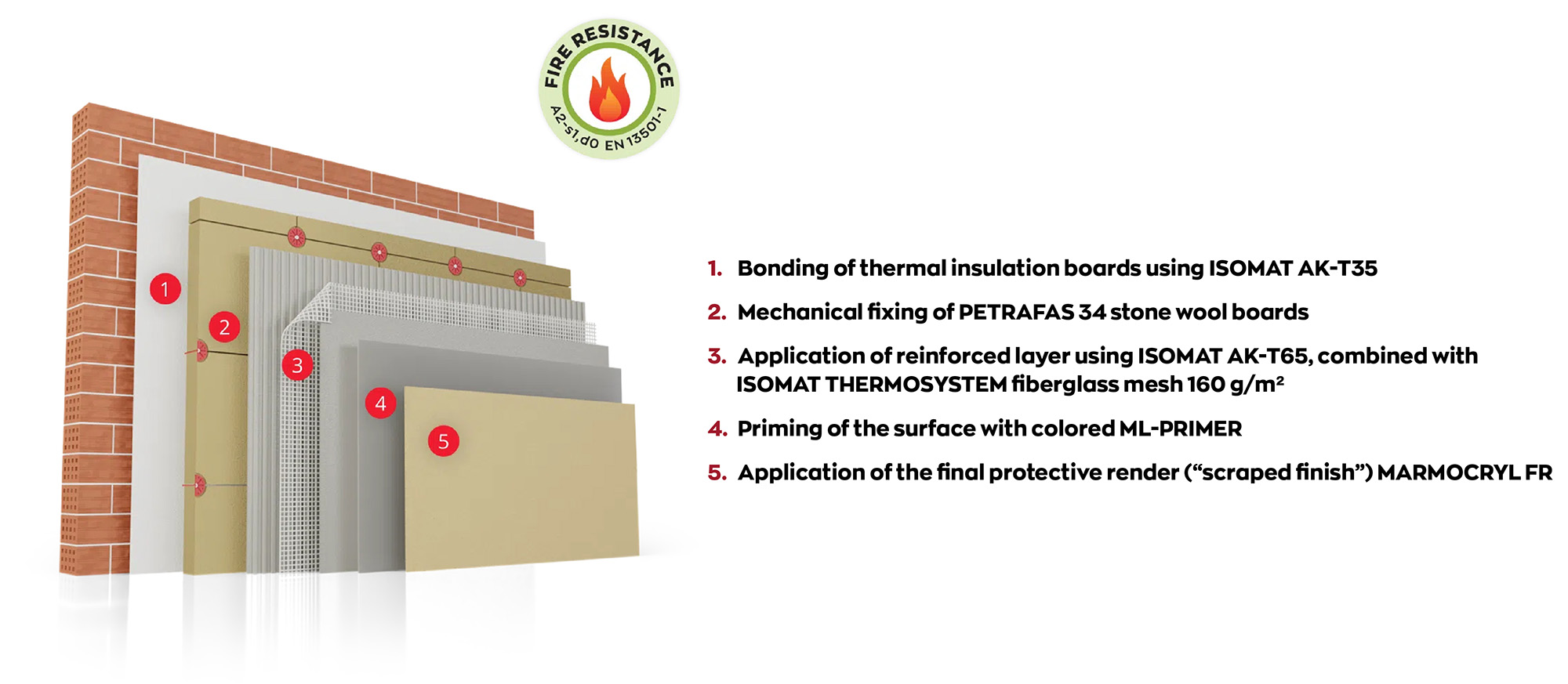 THERMOSYSTEM WOOL is a certified external thermal insulation and building renovation system developed by ISOMAT, suitable for both existing and new buildings. In addition to the high level of thermal insulation it provides, it is characterized by very effective sound insulation properties.