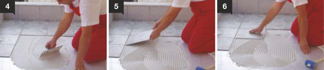 5 & 6. Then we place the tiles and press them in the preferred position, keeping the selected width of the joints constant with the help of grouting crosses.
